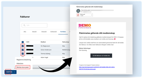 Om ni har obetalda fakturor så är det nu enkelt att skicka ut en kopia på fakturan som en påminnelse till medlemmen. Markera fakturorna, skriv en text och skicka iväg. Mailet innehåller även betalningslänk som gör det enkelt för mottagaren att betala online med era olika betalsätt