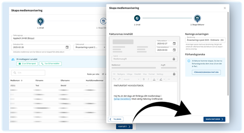 När mallarna är på plats kan du själv skapa en medlemsavisering. När du valt mall, granskat urvalet och kontrollerat att avgifterna stämmer så kan du förhandsgranska fakturorna innan de skapas upp. Efter att genereringen är klar blir du meddelad om nästa steg för att skicka ut dessa.