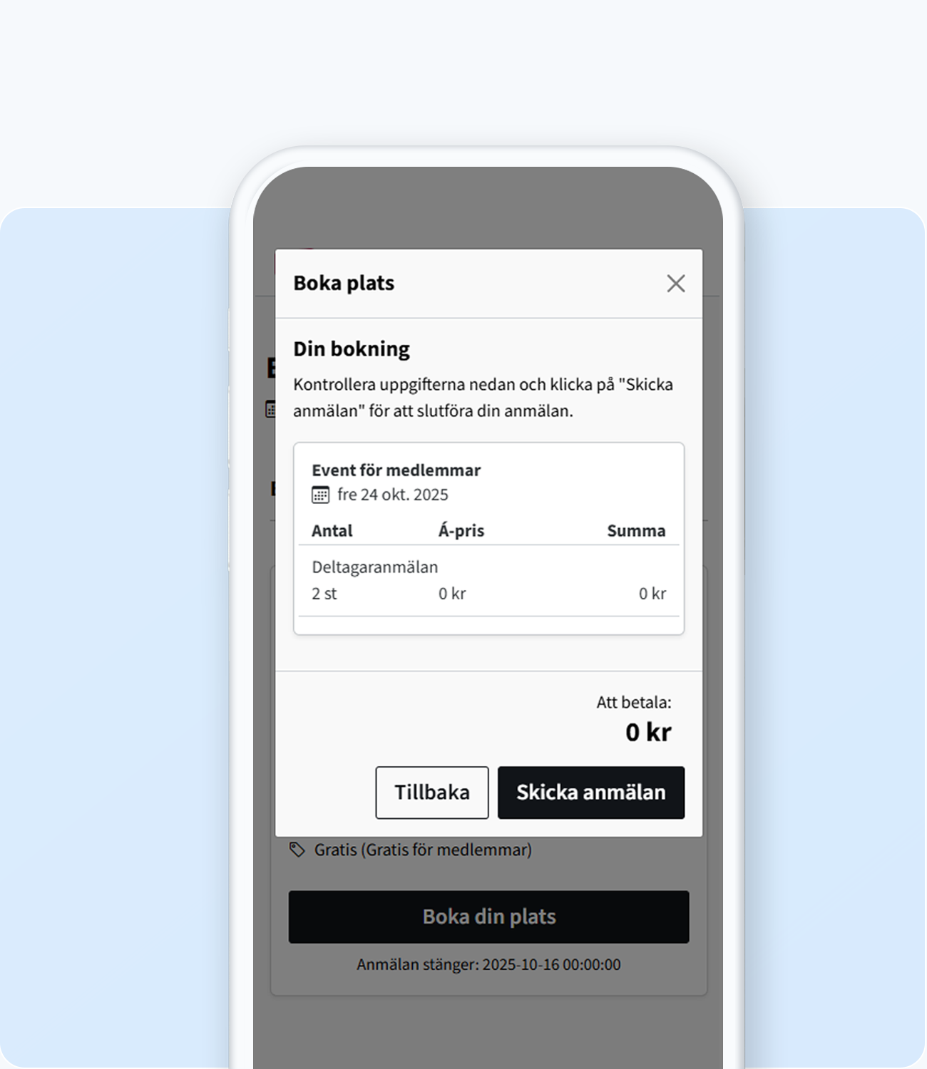 Deltagare kan anmäla flera personer i samma bokning och betala direkt. Du kan även lägga till deltagare manuellt och maila ut en betalningslänk. Differentiera avgifter för medlemmar och icke-medlemmar med enkel inställning.