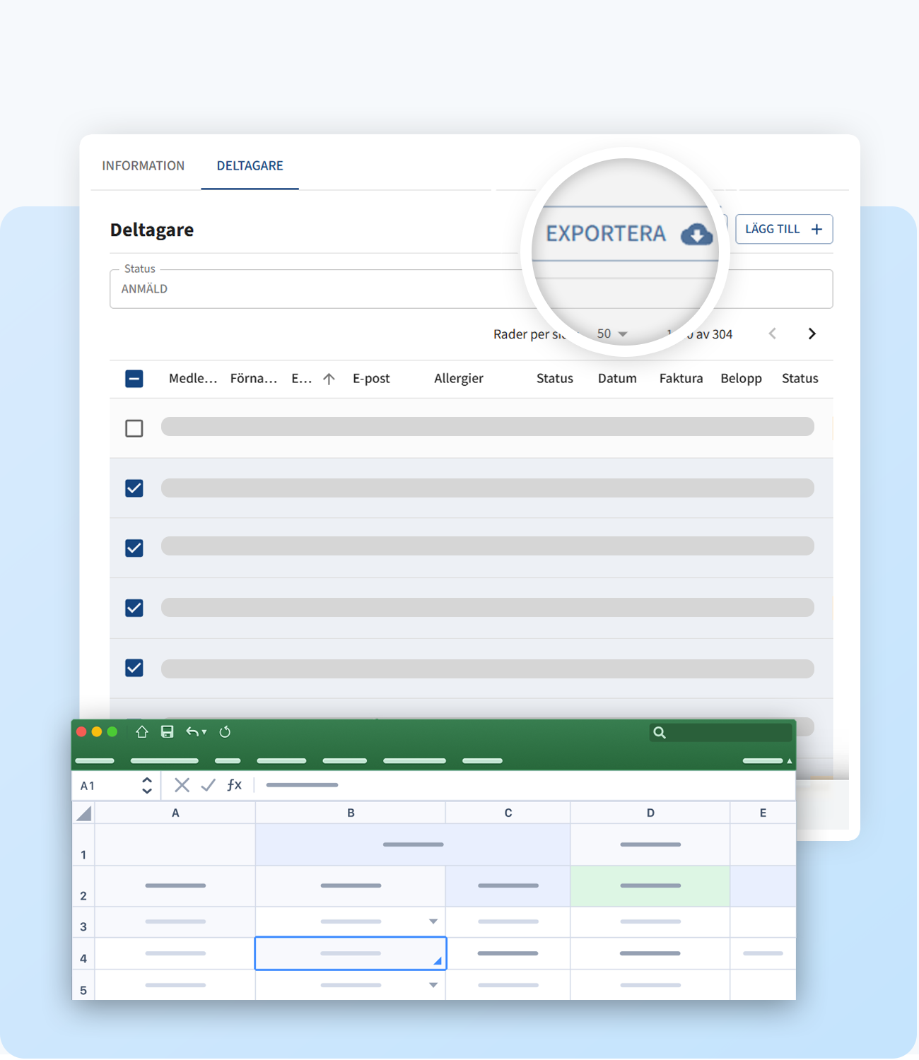 Du kan enkelt söka fram och exportera listor på deltagare till Excel för statistik