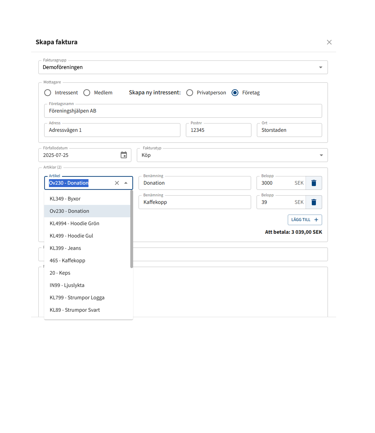 Med artikelregistret kan du skapa och hantera artiklar för sådant som inte avser medlemsavgifter, t.ex för sponsring eller försäljning.