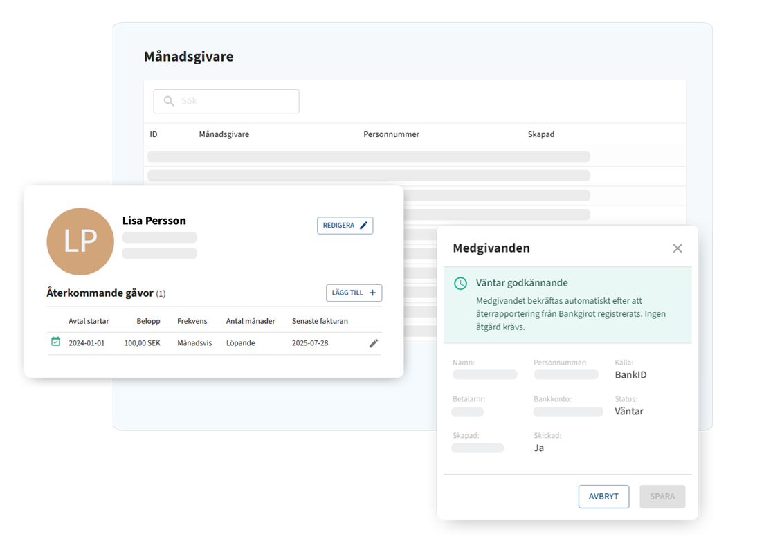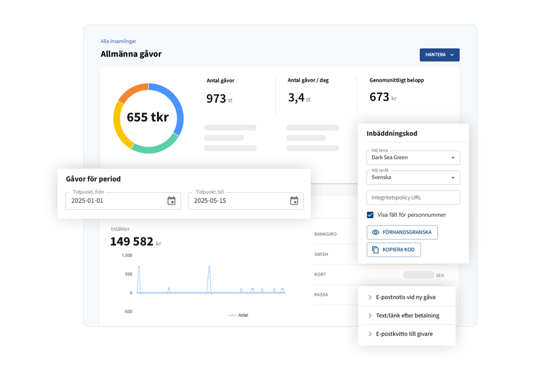 Anpassningsbara gåvoformulär redo att klistras in på er webbplats. Ingen hantering av pappersblanketter eller manuella inbetalningar – allt sköts digitalt och automatiskt.