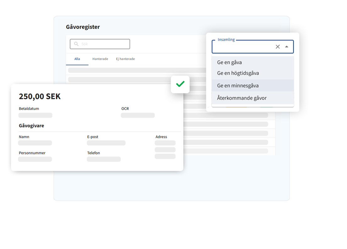 Gåvoregistret ger er en tydlig översikt över alla givare och bidrag, med all givardata från era insamlingar på ett ställe. Här kan du enkel söka fram uppgifter om givare, hantera gåvoblad och exportera. Ni hittar snabbt kontaktuppgifter för att kontakta givare.