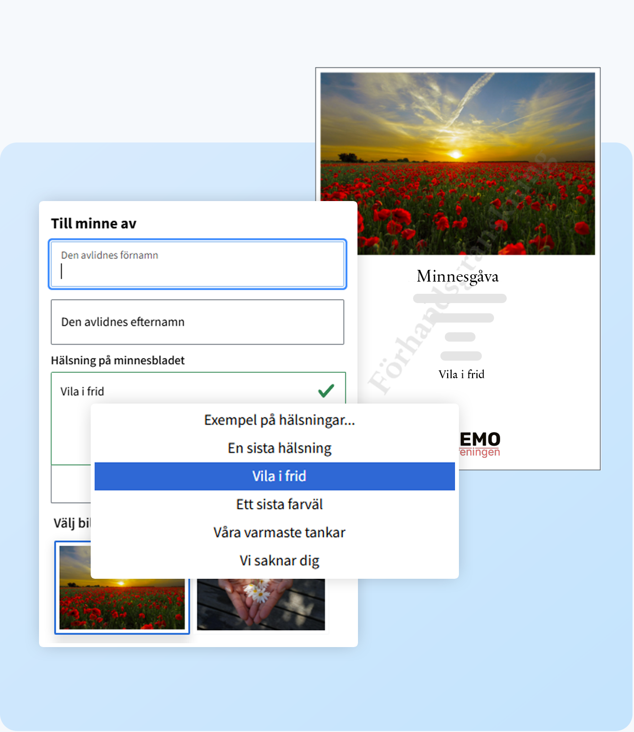 För insamling av minnes- och högtidsgåvor innehåller formulären stöd för gåvoblad. Dessa kan anpassas med valbara motiv och personliga hälsningar för att matcha er grafiska profil.