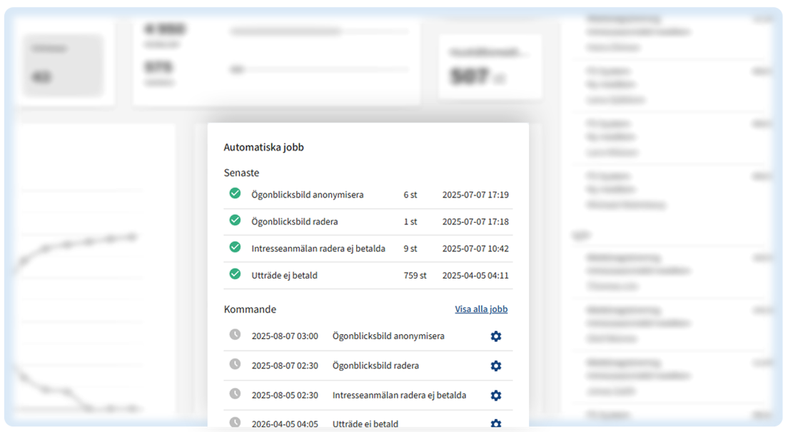 Med systemets automatiska registervård, kontroll av inbetalningar och integrationer mot andra system sparar ni mycket tid på det administrativa arbetet. Dessutom säkerställer du att ni efterlever GDPR och inte lagrar gammal information eller sprider den till obehöriga.