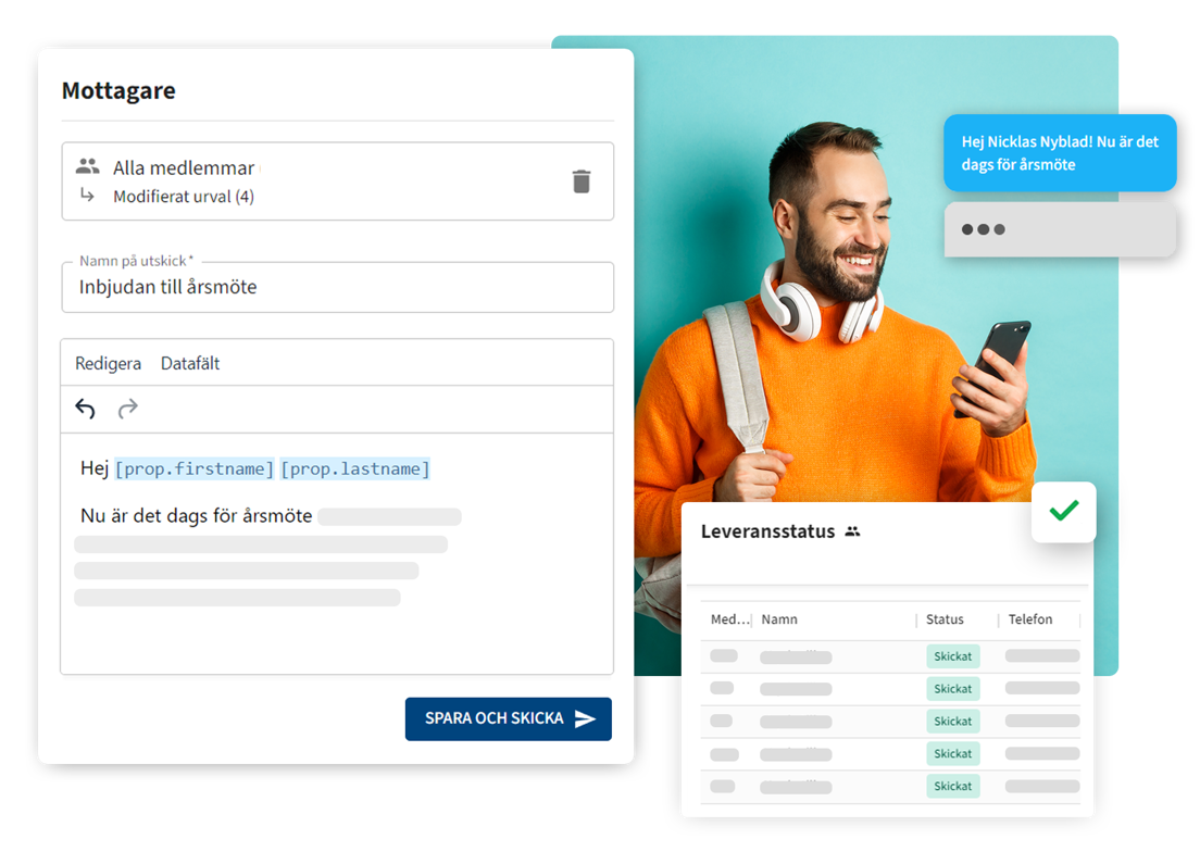 Skicka nyhetsbrev, mötesprotokoll och inbjudningar enkelt via e-post och SMS till fasta grupper eller egna urval av mottagare.