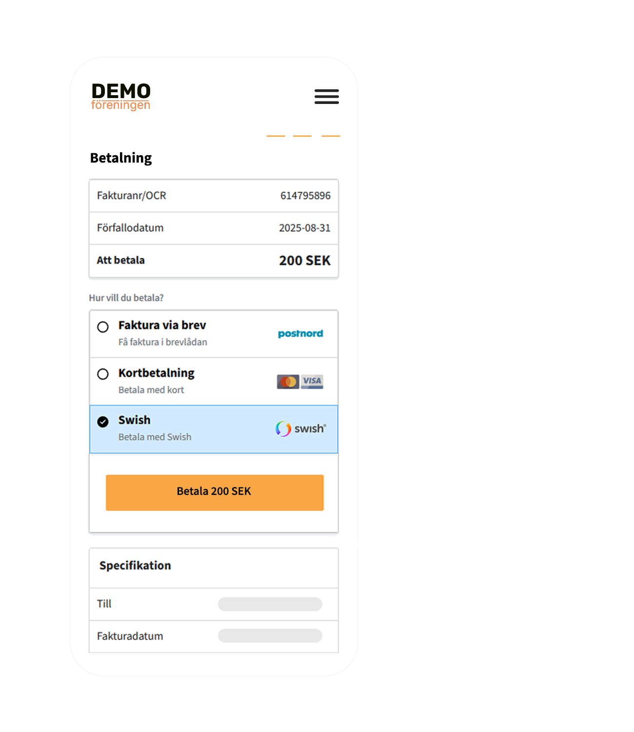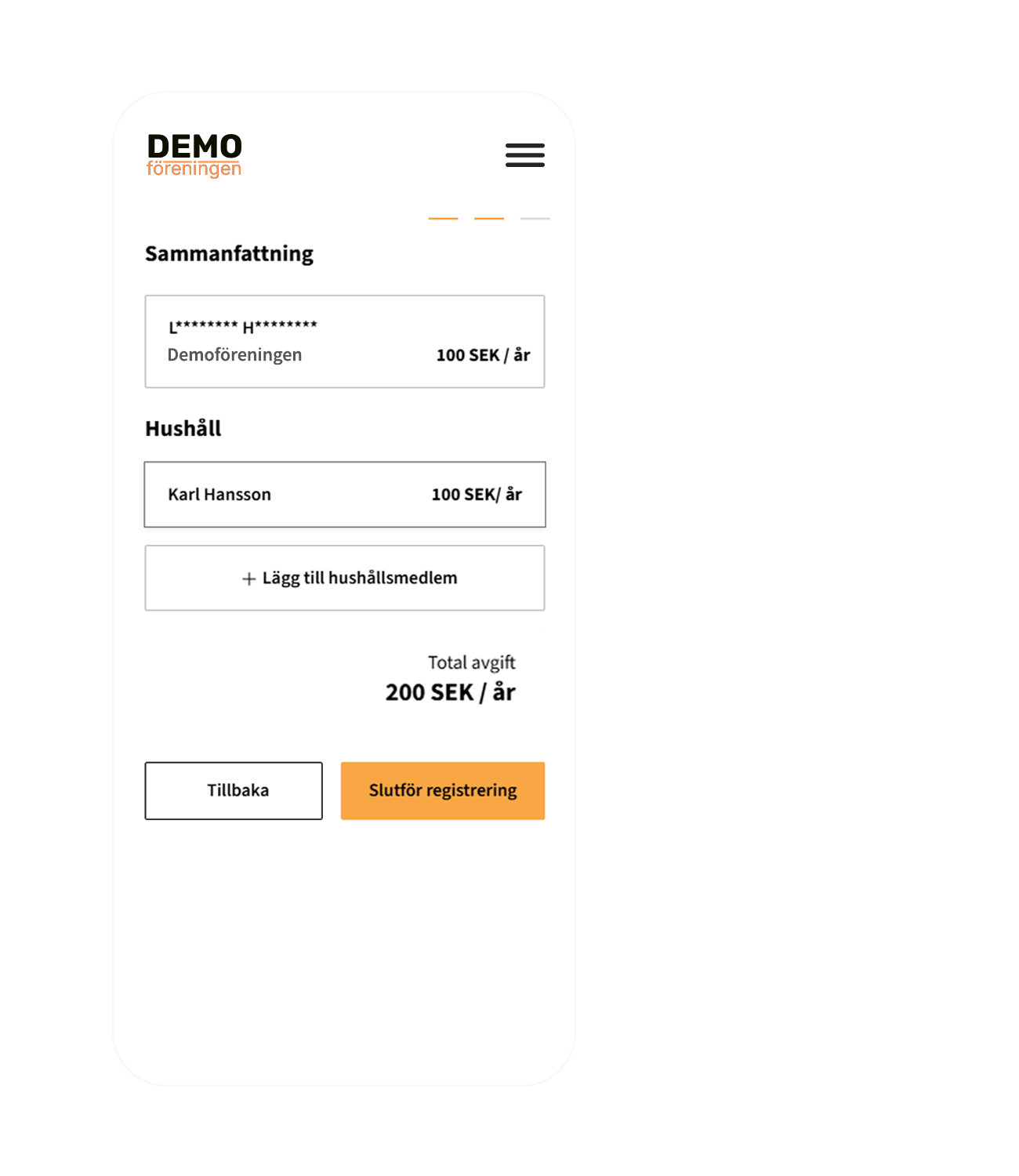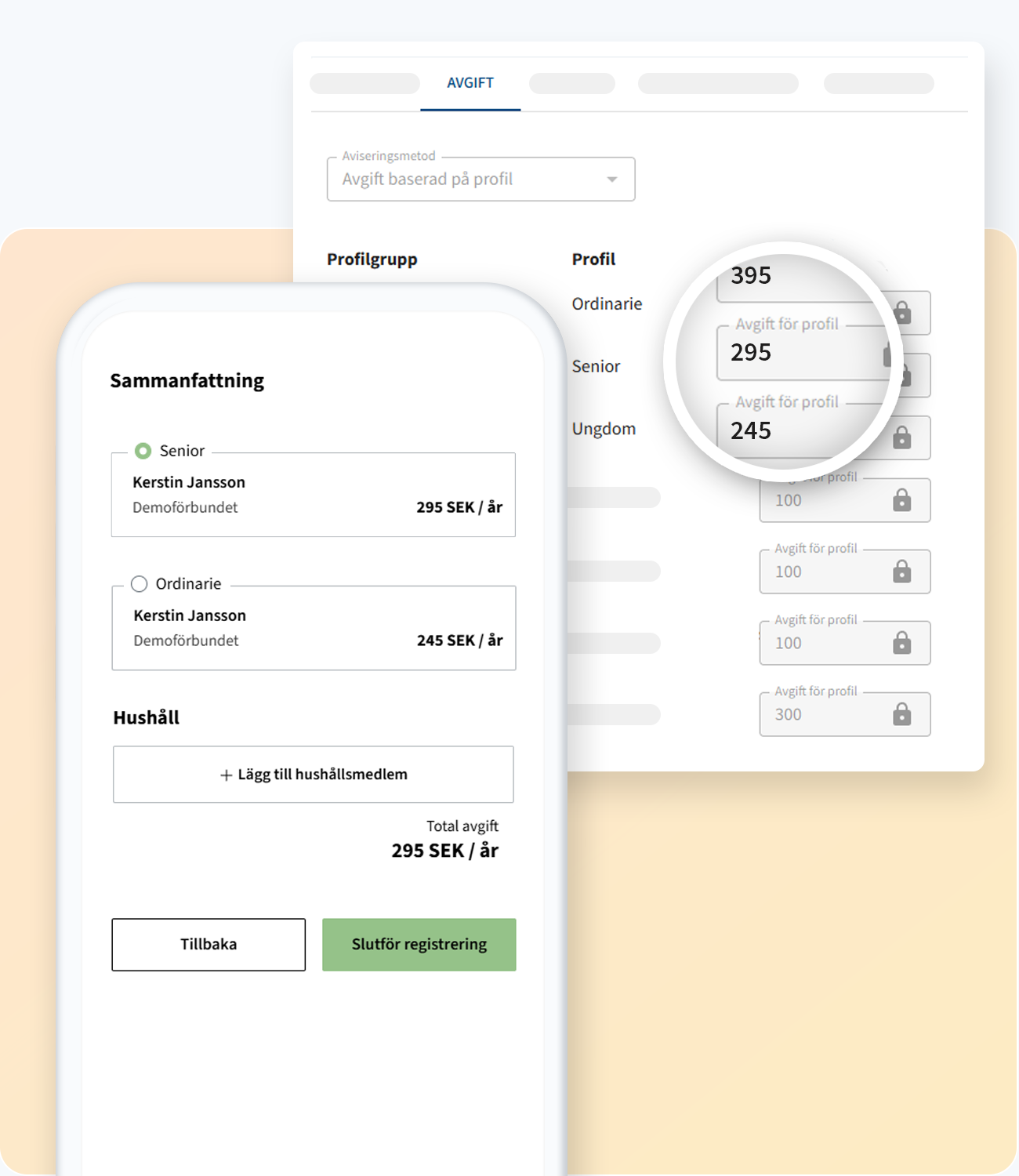 Utifrån medlemstyp eller annat regelverk så beräknas medlemsavgiften innan registrering slutförs och betalsteget aktiveras