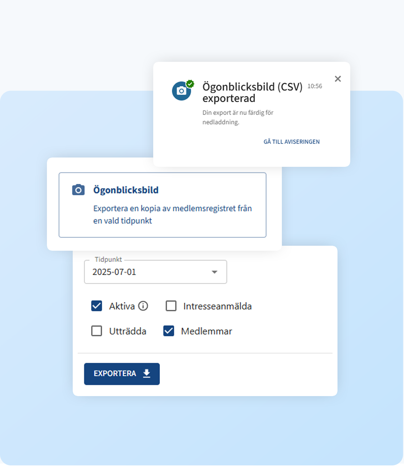 Med hjälp av schemalagda snapshots kan ni alltid få ut data från tidigare tidpunkter. Särskilt användbart då ni behöver sammanställa statistik från hur ert register sett ut vid en given tidpunkt, exempelvis för underlag till bidragsansökningar.