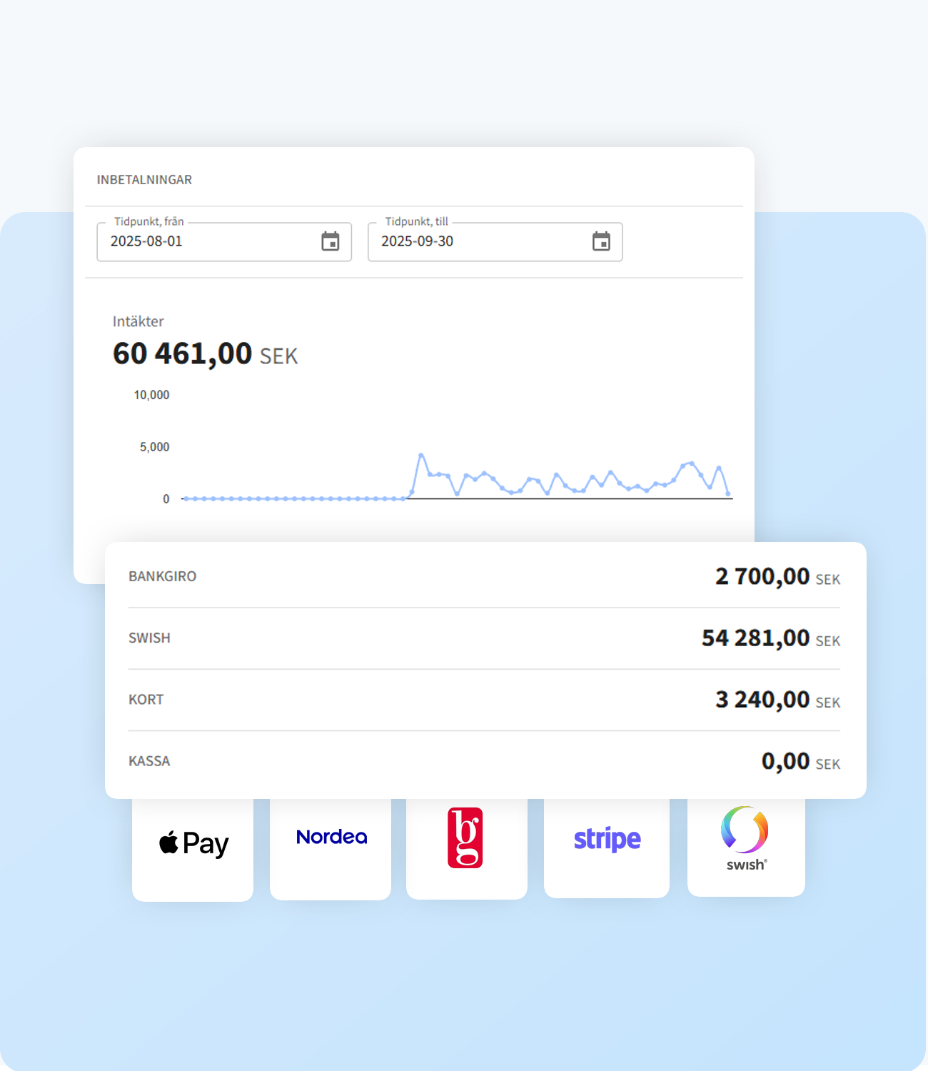 Med statistik över intäkter ser du snabbt totalen över inbetalningar och hur dessa är fördelade mellan era olika betalsätt.
