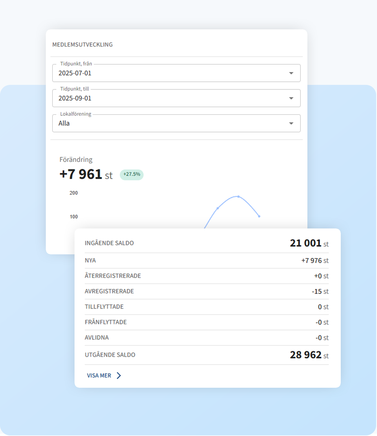 Följ trender i er medlemsutveckling med statistik som uppdateras automatiskt varje månad. Hur många har tillkommit och vilka har blivit utträdda? Med vår statistik får du en överblick som annars är svår med utspridd information.