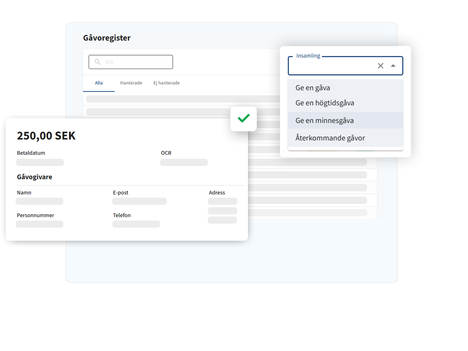 Gåvoregistret gör det lätt att hantera alla gåvor och givare i en central lösning. Ni slipper manuell hantering, sparar tid och minskar fel. Systemet ger er full spårbarhet och trygg dokumentation.
