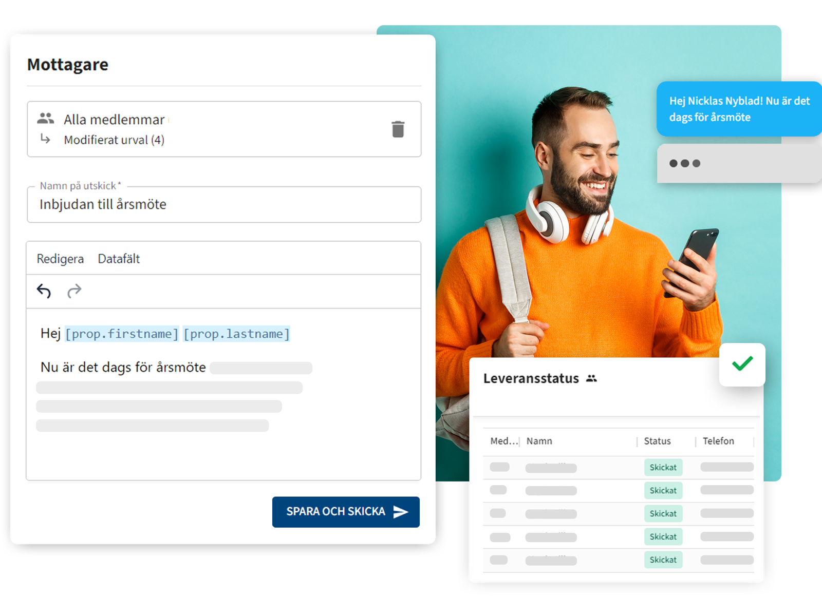 Skicka nyhetsbrev, mötesprotokoll och inbjudningar enkelt via e-post och SMS till fasta grupper eller egna urval av mottagare. Medlemssystemet minimerar tidskrävande hantering och ger möjlighet att ägna värdefull tid till medlemmarna.