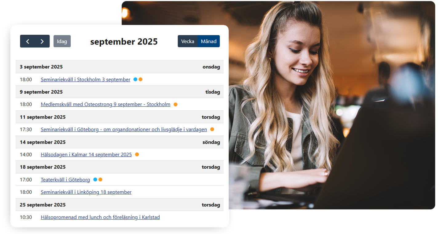 Planera och publicera era stödträffar, föreläsningar eller utbildningar. Hantera anmälningar och avgifter automatiskt, med stöd för både medlemmar och externa deltagare.