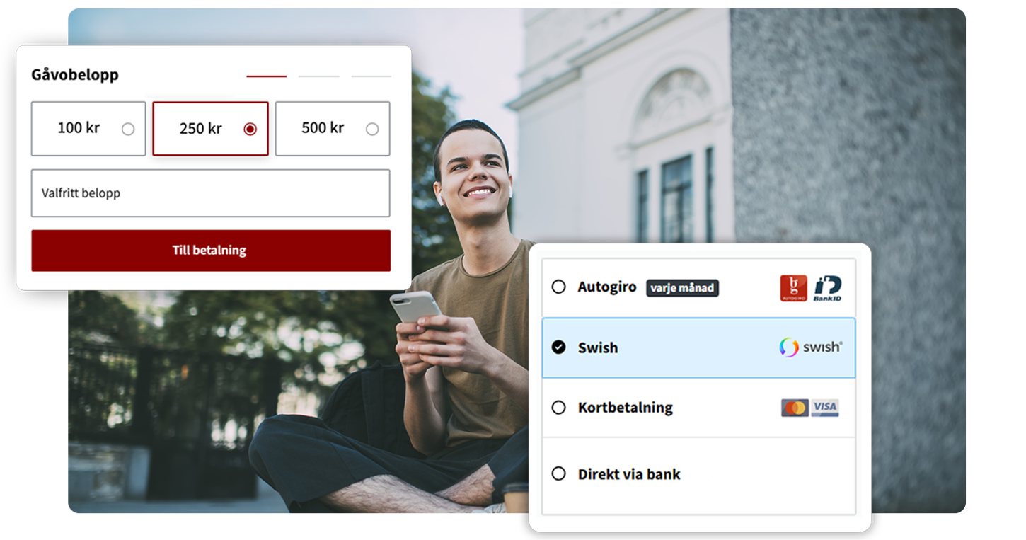 Underlätta för människor att stötta er verksamhet med engångsgåvor via Swish, kort, faktura eller månadsgivande med autogiro. Allt bokförs automatiskt i systemet.